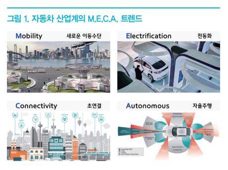 최근 자동차 산업계는 새로운 이동수단을 포함한 다양한 모빌리티 형태에 대한 소비자 및 시장의 니즈 증대, 친환경 xEV(x-Electric Vehicle, x : Hybrid, Plug-in Hybrid, Battery, Fuel Cell)로의 전동화, 차세대 고속 무선통신 기반의 커넥티드 서비스 확대, 자율주행 자동차로의 전환을 의미하는 M.E.C.A.(Mobility, Electrification, Connectivity and Autonomous) 트렌드로의 대전환을 맞이하고 있다.