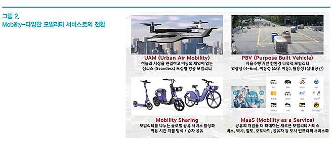 M.E.C.A. 트렌드의 첫번째 키워드인 Mobility는 <그림 2>와 같이, 기존의 대표적인 이동/물류 수단인 자동차뿐만 아니라, 하늘과 지상을 연결하고 이동의 제약이 없는 도심형 항공 모빌리티인 UAM(Urban Air Mobility), 자율주행 기반의 친환경 다목적 모빌리티인 PBV를 포함한 새로운 형태의 다양한 모빌리티의 등장과 이를 기반으로 하는 새로운 서비스의 등장을 의미한다. 특히, 모빌리티의 개념이 소유의 대상에서 필요 시 공유하는 대상으로 전환됨에 따라, 이용 시간 지불 방식의 Car Sharing 서비스, 승차 공유 방식의 Ride Sharing 서비스가 활성화될 것으로 전망되고 있으며, 공유의 개념을 더 확장하여 도시 교통 인프라 전체의 서비스화를 의미하는 Maas(Mobility as a Service)도 종합적으로 검토가 이루어지고 있다.