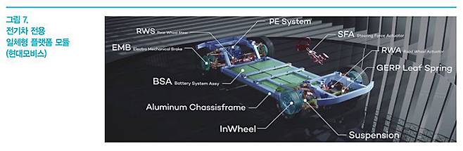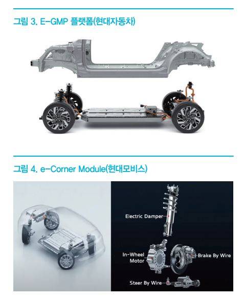 Electric Vehicle) 등 다양한 전동화 솔루션이 소개되어지고 있다. 특히, 내연기관이 삭제된 순수 전기차의 경우, EV 구조 효율화를 위해 완성차 메이커 별로 스케이트보드 플랫폼과 같은 순수 전기차 전용 플랫폼을 적용하고 있는 추세이다.