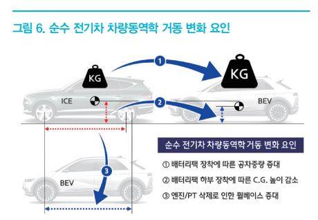 이러한 전동화 트렌드는 <그림 6>에 나타낸 것과 같이, 순수 전기차 전용 플랫폼 적용에 따라, 배터리팩 장착에 따른 공차중량 증대, 배터리팩 하부 장착에 따른 무게중심 높이 감소, 엔진 및 파워트레인 삭제로 인한 휠베이스 증대 등의 요인들에 의하여 차량동역학 관점에서의 거동 변화를 수반하게 된다.