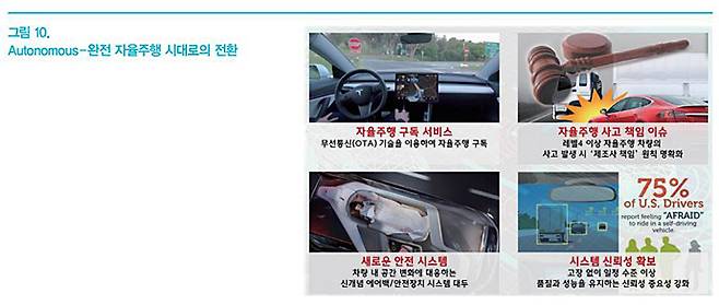 M.E.C.A. 트렌드의 마지막 키워드인 Autonomous는 <그림 10>과 같이, 카메라, 레이더, 라이다 센서와 같은 환경센서를 기반으로 고성능 인지/판단 제어기가 적용된 완전 자율주행 자동차 시대로의 전환을 의미한다. 운전자의 개입없이 출발지에서부터 목적지까지 자율주행이 가능해질 경우 운전자는 해당 시간만큼 다른 부분에 시간을 할애할 수 있다는 측면에서 소비자들의 기대가 커지고 있는 실정이며, 각국 정부와 자동차 산업계는 완전 자율주행 자동차 시대로의 전환을 위하여 다양한 법규 제정 및 신기술 개발을 활발히 진행하고 있다. 이와 더불어, 자율주행 기능을 차량 구입 시에 옵션 형태로 지불하는 것이 아닌, 자율주행 기능 사용 시마다 요금을 지불하는 형태의 OTA 기반 구독 서비스도 제안되고 있으며, 자율주행 자동차 사고 시 책임 이슈에 대해서도 정부와 민간 보험사, 학계로 구성된 다양한 협의체를 통해 사전 연구가 진행되고 있다. 또한, 완전 자율주행 자동차의 승객 착좌 형태가 다양해질 것으로 예상됨에 따라 기존의 안전 시스템인 에어백의 형태에 대해서도 다양한 연구 개발이 진행되고 있다.