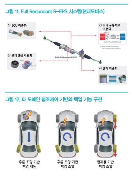 이러한 자율주행 자동차의 핵심 기술은 환경센서 기반의 주행환경 인지 기술과 최적 경로를 결정하는 판단 기술이며, 대부분의 신기술 개발 역량이 해당 기술에 집중되고 있는 것이 사실이다. 하지만 운전자의 손과 발에 해당하는 액추에이터 역할을 수행하는 제동, 조향과 같은 섀시 시스템이 자율주행 제어기의 감속 및 조향 제어 명령을 제대로 수행하지 못한다면 자율주행 기능 구현이 불가능하기 때문에, 기존의 섀시 시스템은 높은 수준의 신뢰성 확보를 요구받고 있는 실정이다. 섀시 시스템에 요구되는 높은 수준의 신뢰성은 E/E(Electric and Electronic) 시스템을 구성하는 소프트웨어와 하드웨어의 안전 무결성(Safety Integrity) 확보를 의미하며, 주요 구성요소의 리던던시 설계 적용 및 타 도메인 협조제어 기반의 백업 기능 구현을 통해 확보가 가능하다. 먼저, 섀시 시스템을 구성하는 주요 구성요소의 리던던시 설계 적용의 경우 <그림 11>에 나타낸 조향 시스템의 예시와 같이, 제어기 ECU 이중화, 모터 구동회로 이중화, 액추에이터 내부의 모터권선 이중화, 센서 이중화를 통해 구현이 가능하며, 동일한 기능을 수행하는 2개 이상의 구성요소 적용을 통해 1개의 구성요소가 고장이 나더라도, 나머지 1개의 구성요소를 통해 동일한 기능을 수행할 수 있는 개념이다.