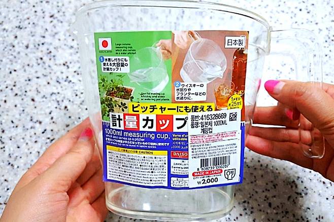 요리할 때 물양을 잘 맞추는 게 중요하죠. 다이소 계량컵은 1,000ml라 다양한 국물요리에 사용하기 편리한데요