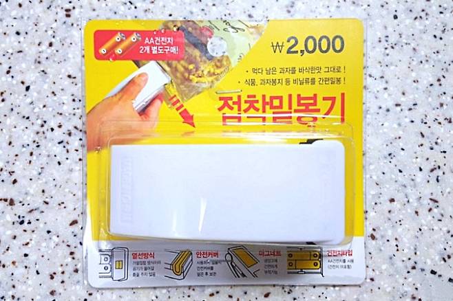 요리 유튜버 소개로 유명해진 다이소 접착 밀봉기입니다. 건전지를 넣어 사용합니다. 사용 후 냉장고에 부착할 수 있습니다.