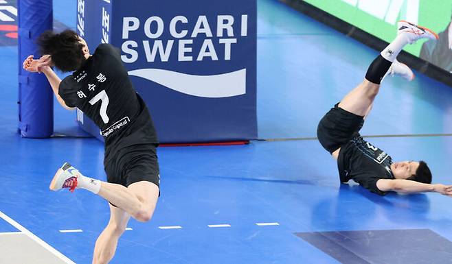 정지석의 공격을 아시아 쿼터 선수 덩신펑(등록명 신펑)이 블로킹으로 막아내면서 승부를 마무리했습니다.