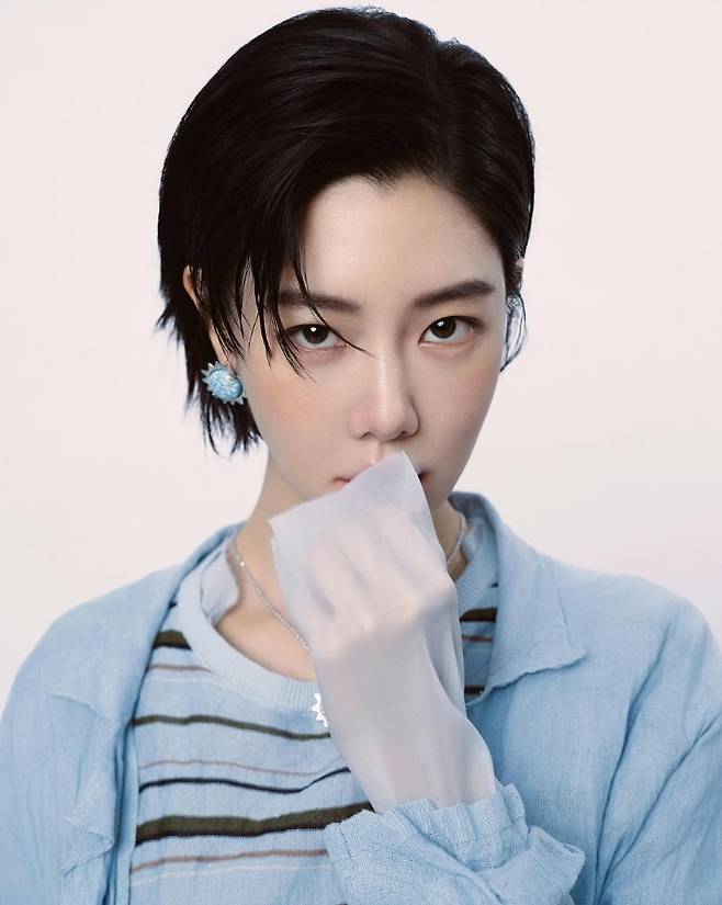 클라라는 청량한 스카이블루 셔츠와 스트라이프 니트 레이어드로 내추럴하면서도 감성적인 분위기를 자아냈습니다.