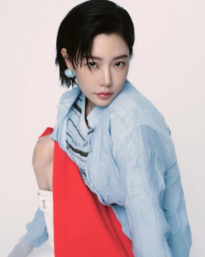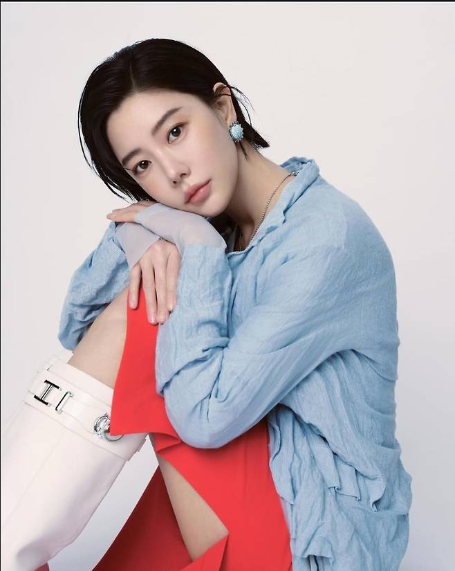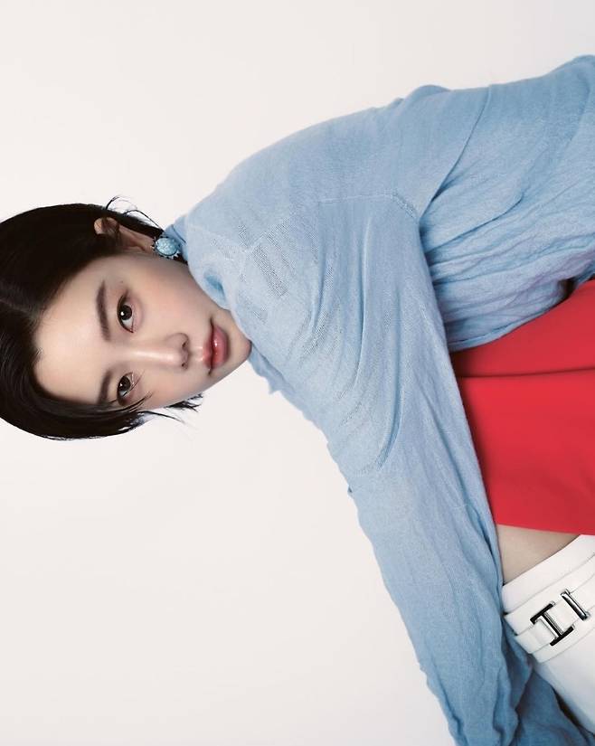 간결한 단발 스타일에 블루 플라워 이어링을 매치해 세련된 디테일을 더했으며, 레드 포인트 스커트와 화이트 부츠 조합으로 스타일리시한 믹스매치를 완성했습니다.