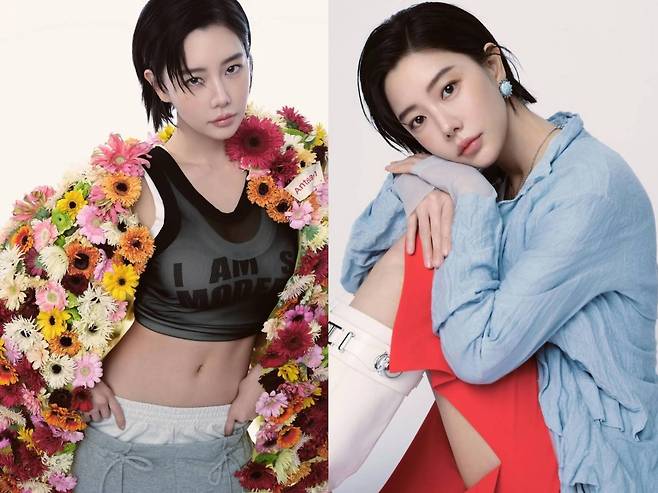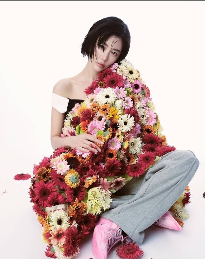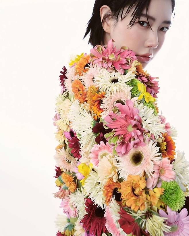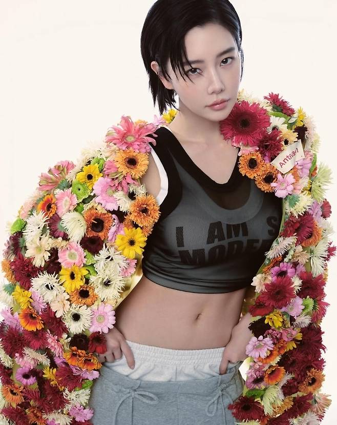 이어진 컷에서는 온몸을 덮은 형형색색 꽃 장식 아우터와 스포티한 브라톱, 그레이 조거팬츠를 매치해 파격적인 대비를 선보였습니다.