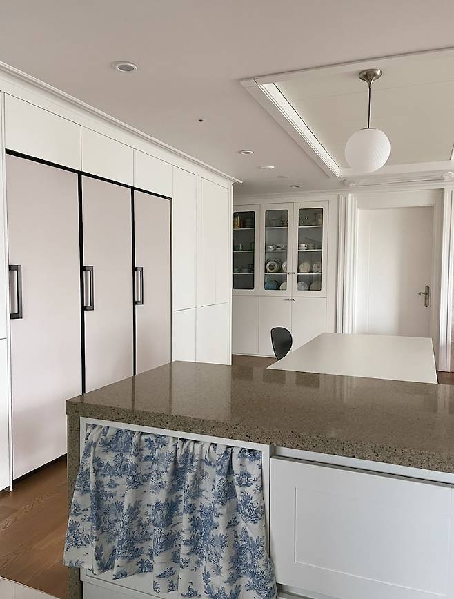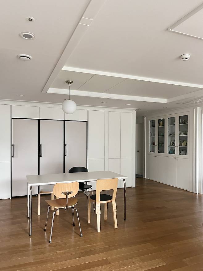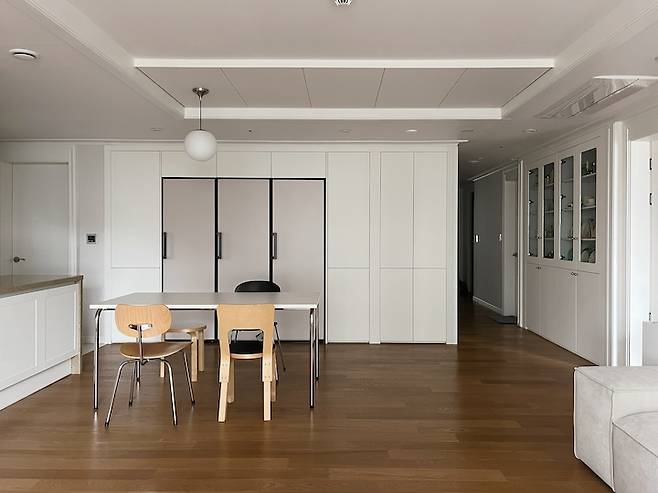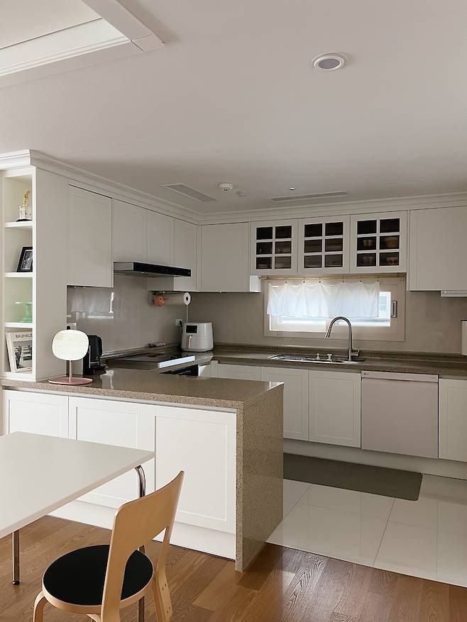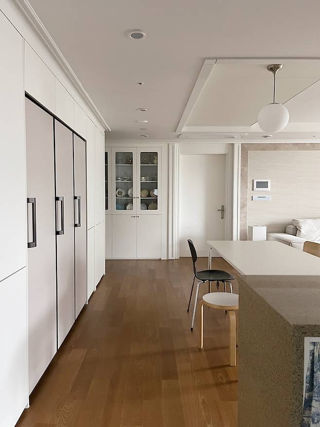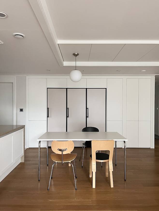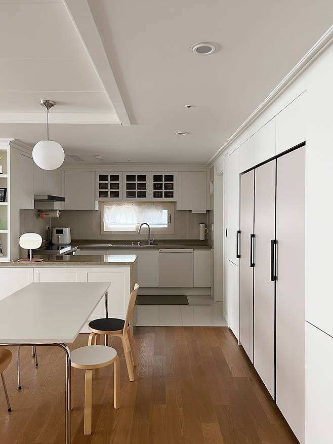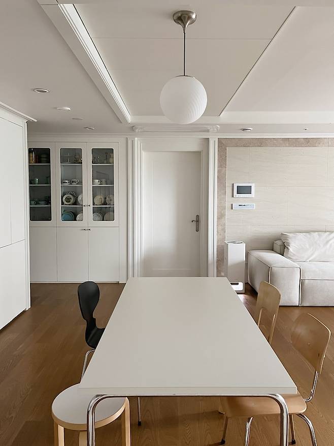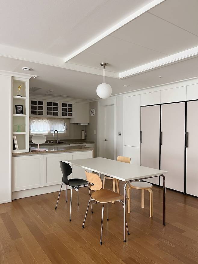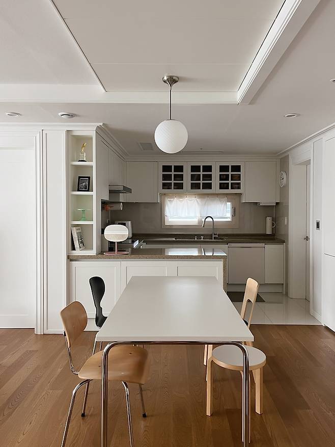 평범한 ㄷ자 주방이에요. 40평대 주방 치고는 살짝 작은 듯한데 그만큼 거실이 넓어진 것 같아 저는 더 좋아요. 단아한 느낌의 둥근 볼 주방등으로 포인트를 줬고 테이블과 의자는 심플하면서도 엣지있는 느낌으로 스타일링 했어요. 화이트 주방과 우드 바닥이 조화를 이뤄 따뜻한 분위기를 연출해요.