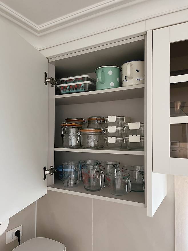 다른 한 쪽에는 계량 컵과 반찬 통을 넣어놨어요. 요리할 때 제일 먼저 꺼내는 도구가 계량 컵인데 가장 쉽게 손 닿는 위치에 있어요. 상부장 내부는 선반 높이를 조절해서 최대한 빈 공간 없이 수납이 가능하도록 했어요. 그때그때 정리하기도 편해요.
