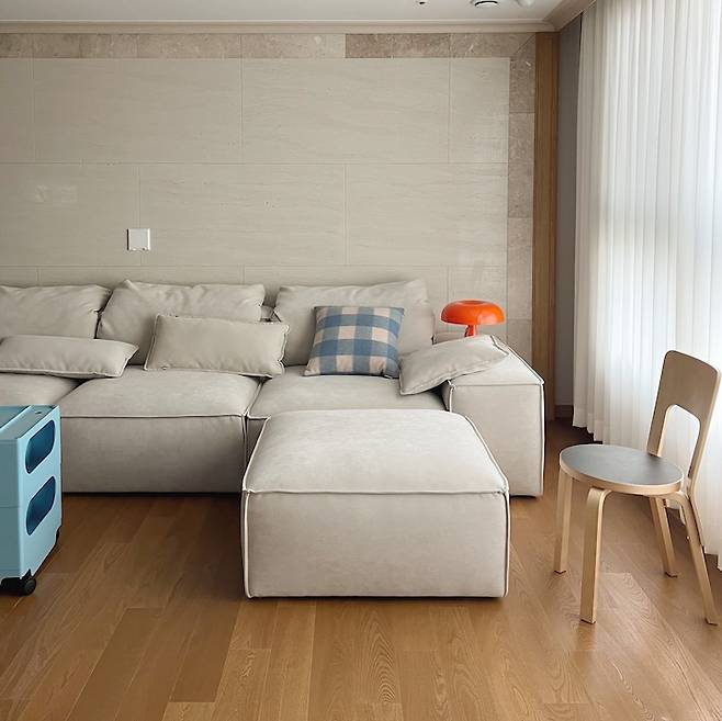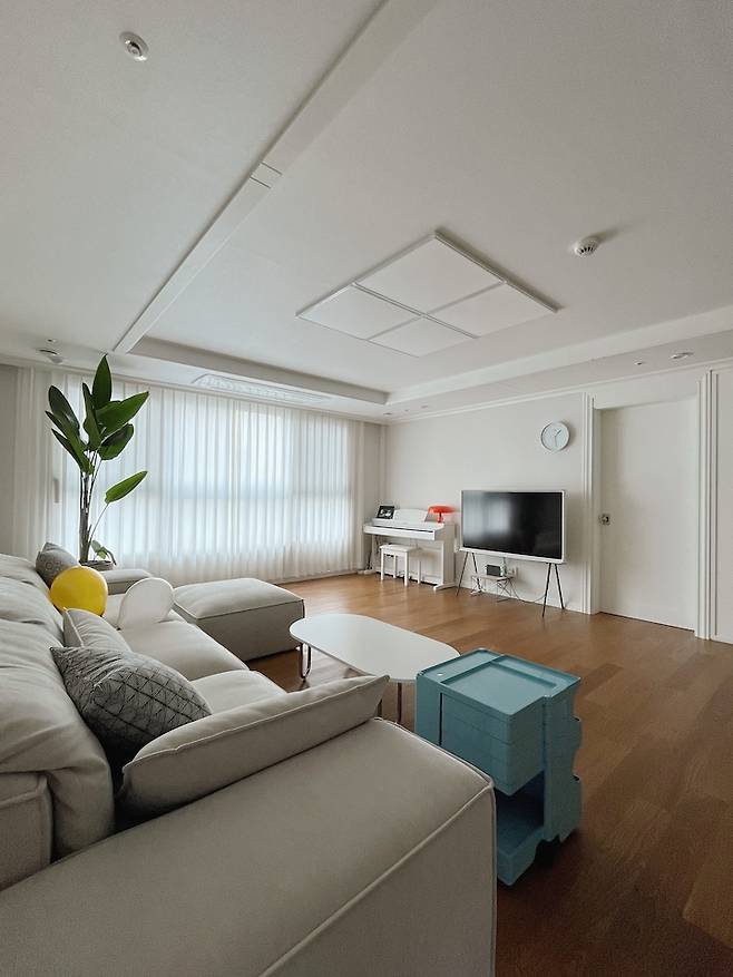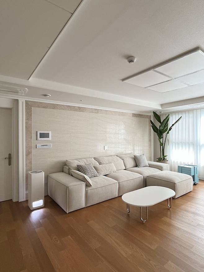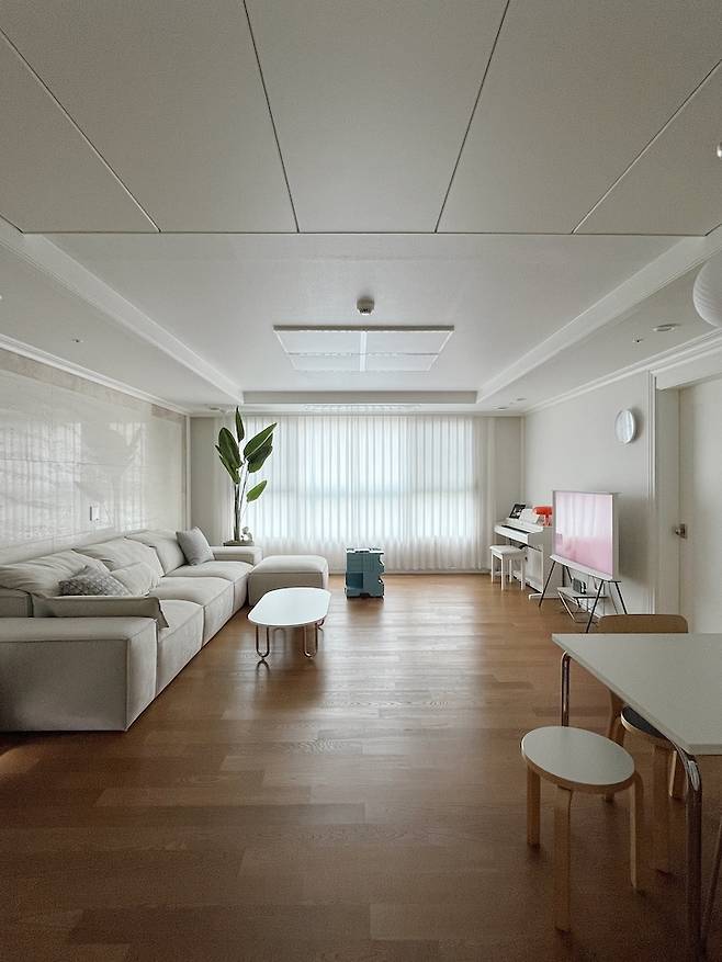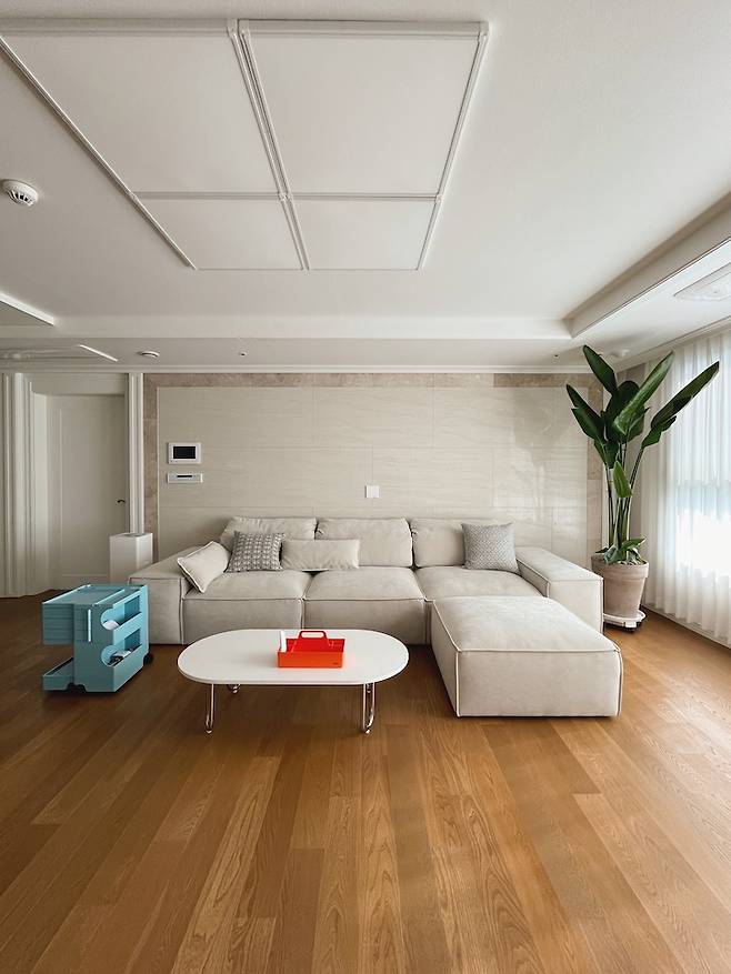 거실이 넓게 빠진 편이라 큰 소파를 두어도 여유가 있어요. 모듈 쇼파라서 가끔 위치도 바꾸고 다양한 시도를 해보는데 일자로 쭉 붙인 자리가 제일 편하더라구요. 요즘은 이 모습을 계속 유지하고 있어요. 거실을 최대한 넓게 활용하고 싶어서 물건을 많이 안두려고 해요. 탁 트인 거실을 바라볼 때면 기분이 좋아요.