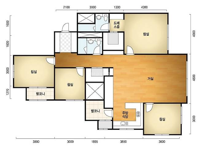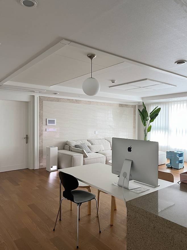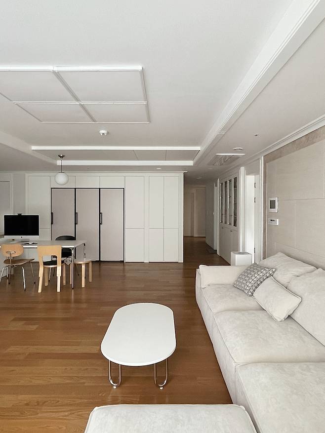 저희 집은 주상복합 타워형 구조로 거실이 넓게 빠졌어요. 긴 복도를 지나면 넓은 거실이 나오는데 거실과 주방의 경계가 크게 없다 보니 더 넓게 느껴지는 것 같아요. 남향이라 통창으로 빛이 깊숙이 들어오는 점이 마음에 들어요.