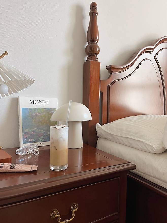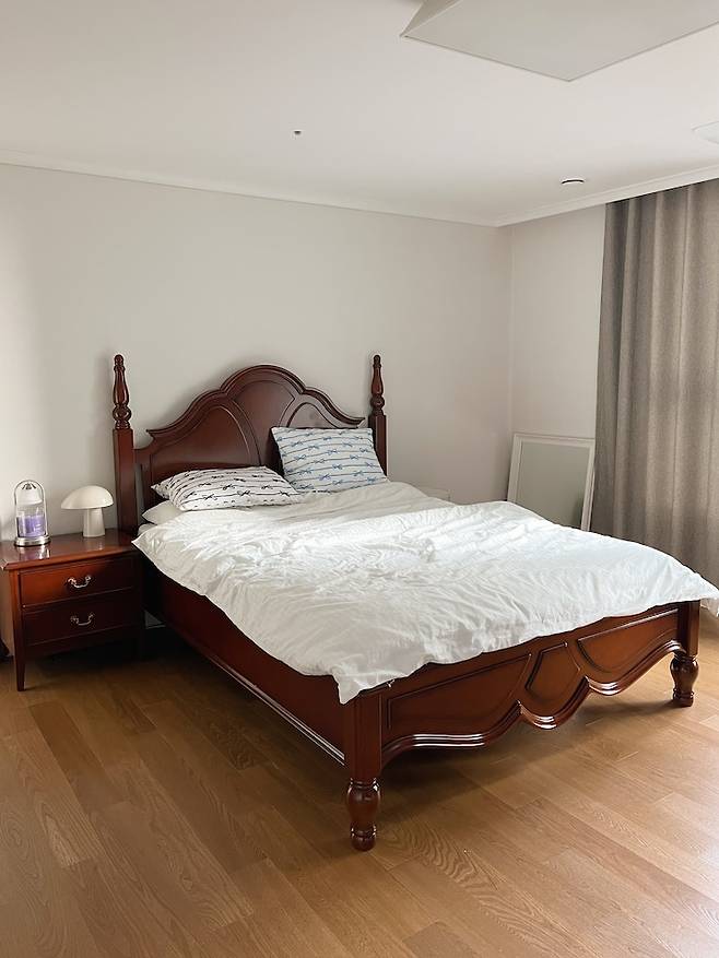 앤틱한 침대가 센터에 있어서 침실 전체의 중심을 잡아줘요. 양쪽으로는 전혀 다른 디자인의 사이드 테이블을 두었는데 잘 어울리는 것 같아요. 왼쪽 오른쪽 다른 분위기가 연출되는게 포인트예요.