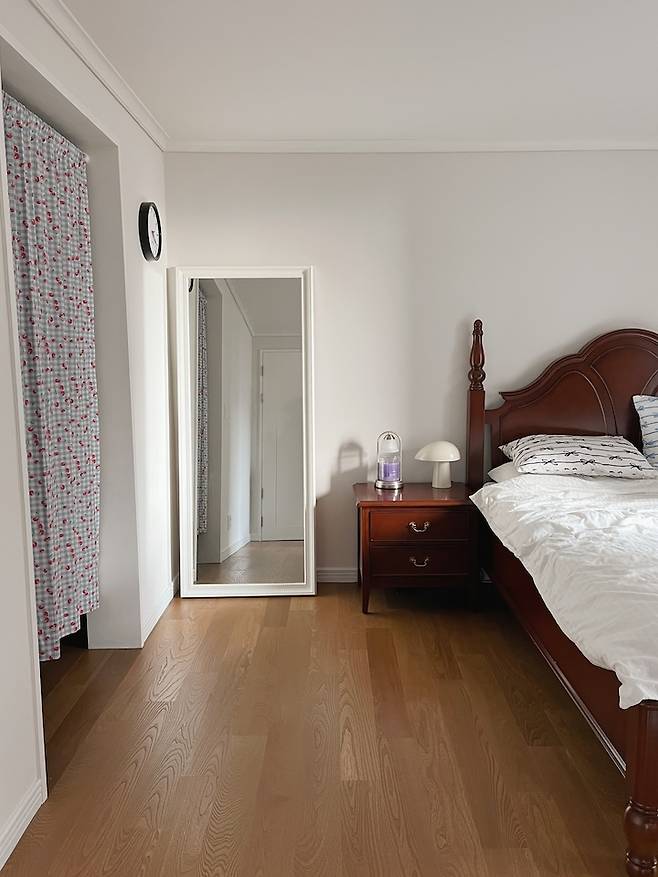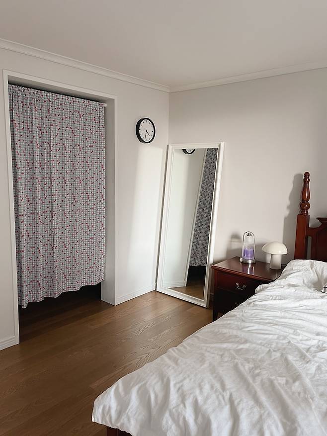 드레스룸으로 이어지는 곳에 전신 거울을 두어 틈틈이 스타일링 체크를 해요. 거울은 원래 골드 프레임이었는데 색이 바래져서 이번에 셀프 페인팅하고 남은 페인트로 칠했어요. 깨끗한 화이트 프레임이라 방 분위기와도 잘 어울리고 완전 새 거울로 변신되서 뿌듯했어요.
