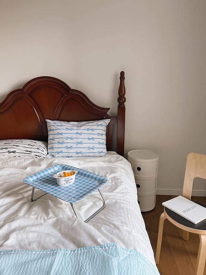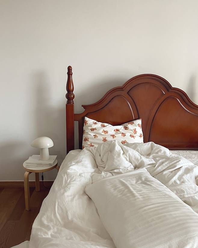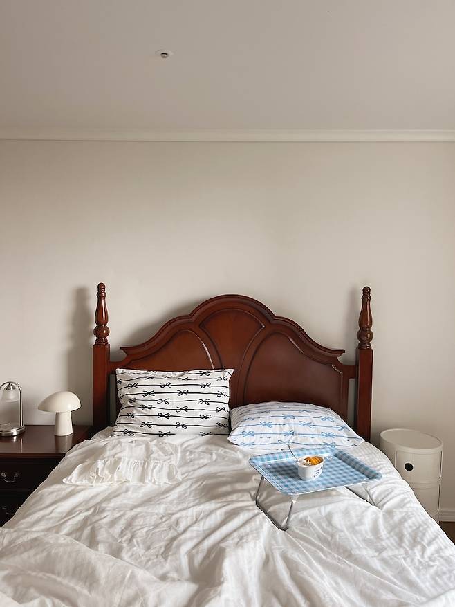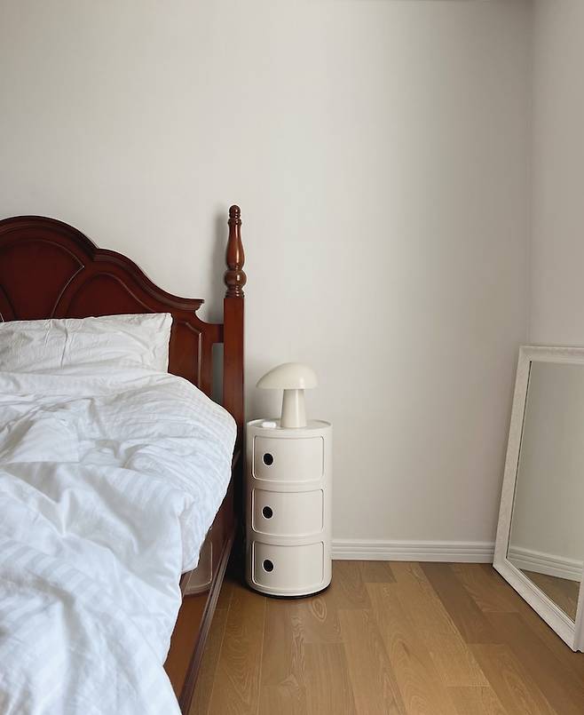침대 옆 사이드 테이블은 어릴 때 쓰던 스툴이에요. 조명을 올려두니 원래 세트였던 것처럼 잘 어울리네요.