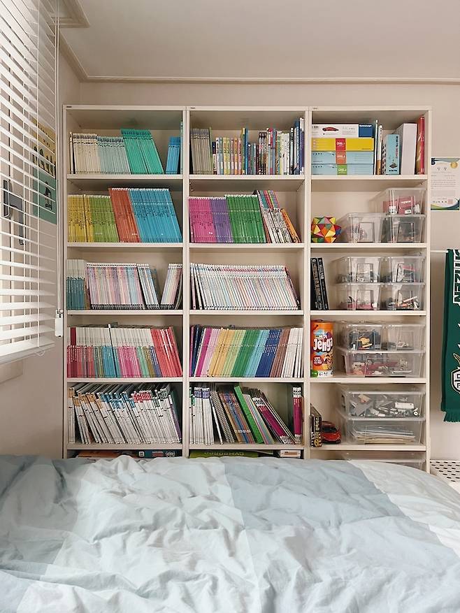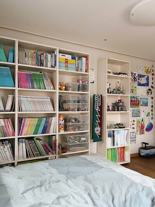 저는 같은 디자인의 책장을 나란히 세워 통일감을 줬고 그 안에 모든 물건들을 다 정리했어요. 방도 넓어 보이고 한눈에 봐도 정리된 모습이라 안정감이 있어요. 빈 여백에는 아이의 미술 작품을 전시해두었어요.