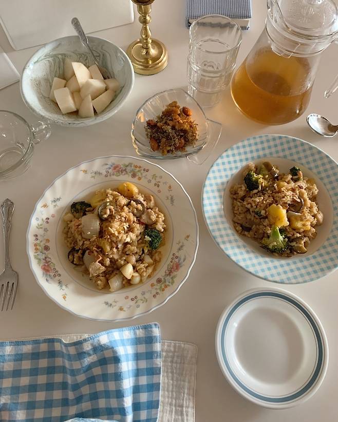 심플한 볶음밥도 예쁜 그릇에 담으면 더 먹음직스러워 보여요. 그릇을 세팅할 때 여러 브랜드의 그릇을 섞어서 쓰는 편이예요. 크기도, 모양도, 패턴도 다 다르지만 각자의 매력이 있어서 좋더라구요. 재밌기도 하구요.