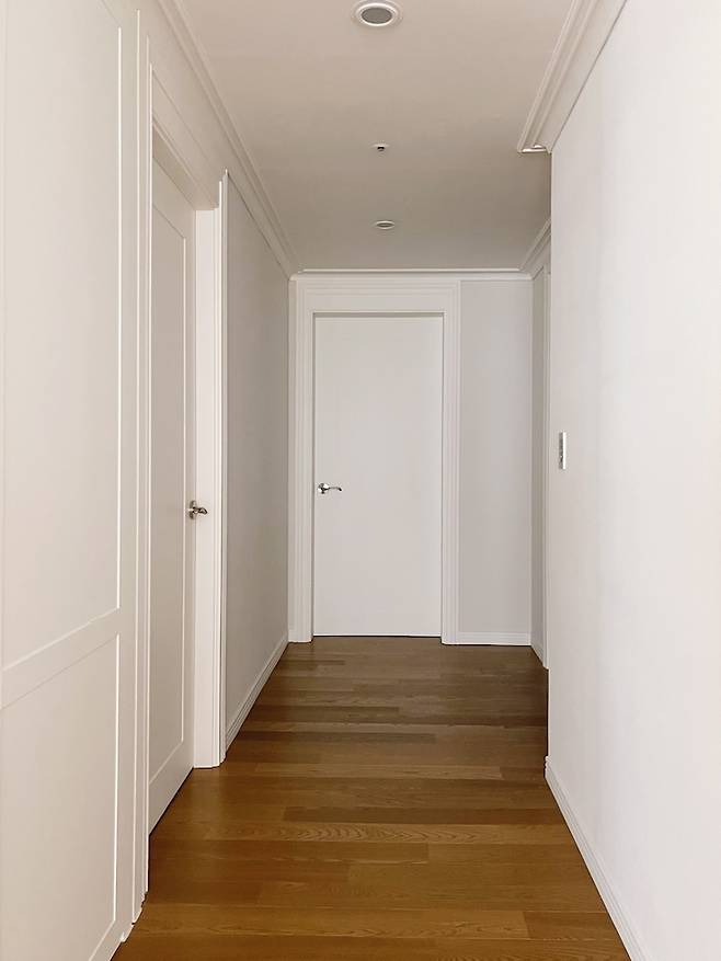 처음엔 두꺼운 몰딩이 싫었는데 화이트 페인팅을 하고 난 이후로는 제가 좋아하는 클래식한 느낌도 나고 만족스러워요. 무문선 무몰딩이 아니더라도 취향에 맞게 몰딩도 살릴 수 있다는 것을 꼭 알려드리고 싶어요.