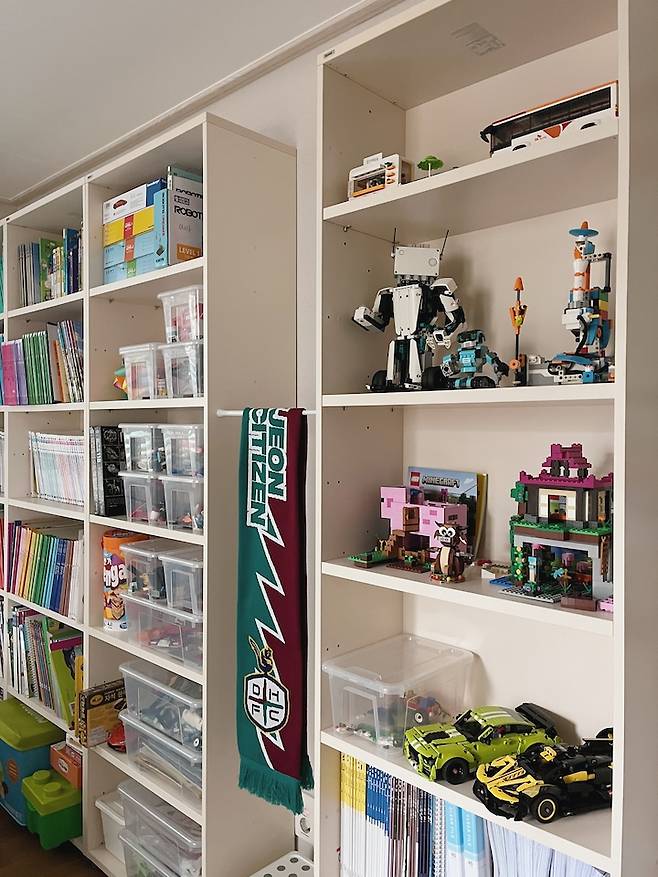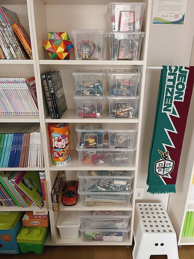 레고를 정말 좋아하는 아이인데 작은 레고 조각들 정리하기가 진짜 힘들잖아요. 투명한 수납함을 이용해 한 눈에 보일 수 있게 정리해두니 찾기도 쉽고 정리도 편하고 대만족이에요. 수납함도 같은 디자인으로 통일감 있게 했어요.