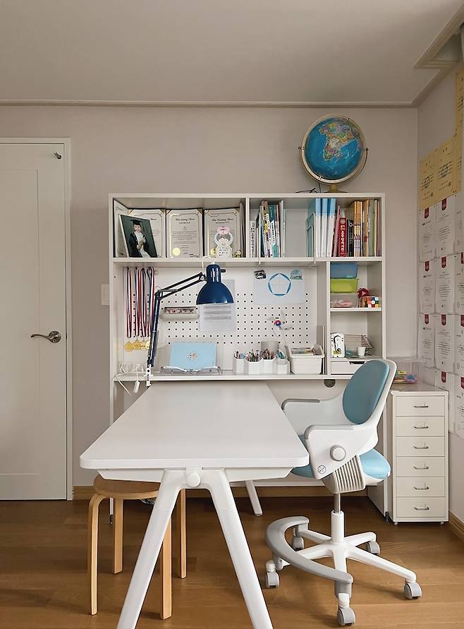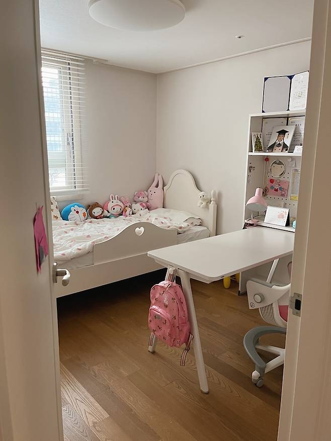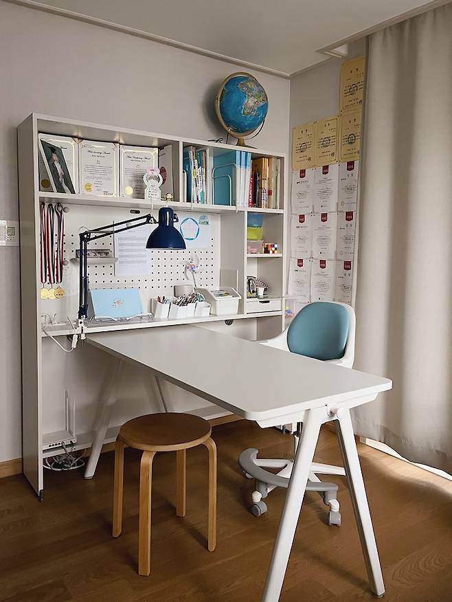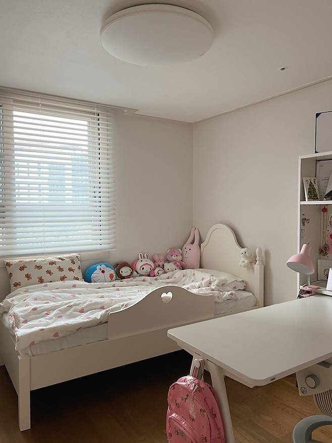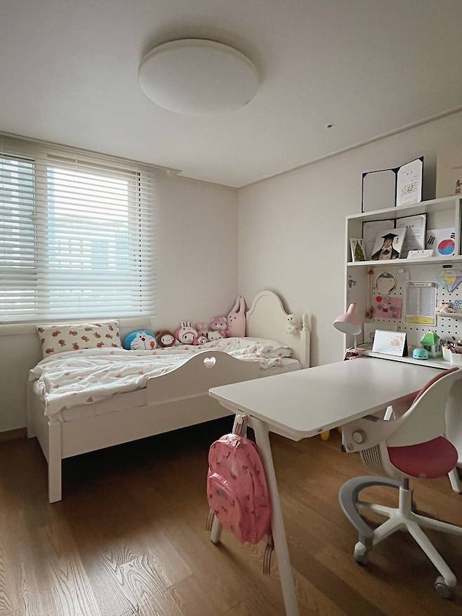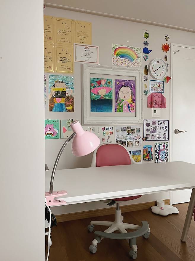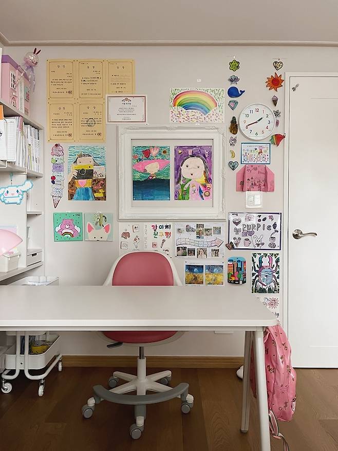 딸 아이방 역시 아들방과 똑같은 책상이에요. 아이의 스타일에 맞게 어떻게 꾸미느냐에 따라 분위기가 많이 다르네요. 책상 위치는 원하는 대로 자유롭게 옮겨가며 쓰고 있어요. 저랑 같이 마주 보며 그림도 그리고 간식도 먹어요.