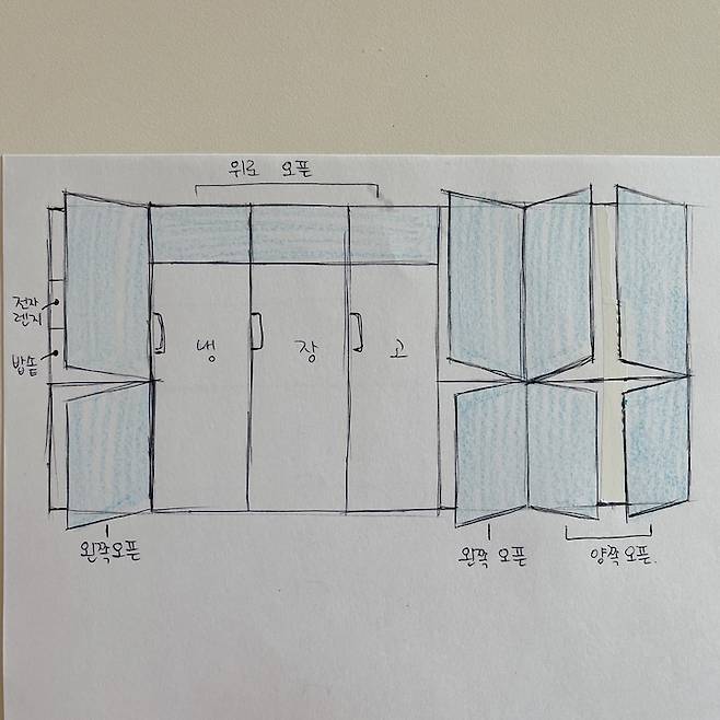 업체에 제가 원하는 느낌의 사진을 보내드리고 간단하게 그림을 그려 설명해드렸어요. 여기서 포인트! 의뢰할 때 문 여는 방향도 꼭 전달해주세요. 저는 제가 편한 동선 생각하며 도어 오픈 방향, 내부 칸 높이, 갯수 등 디테일하게 말씀드렸어요.