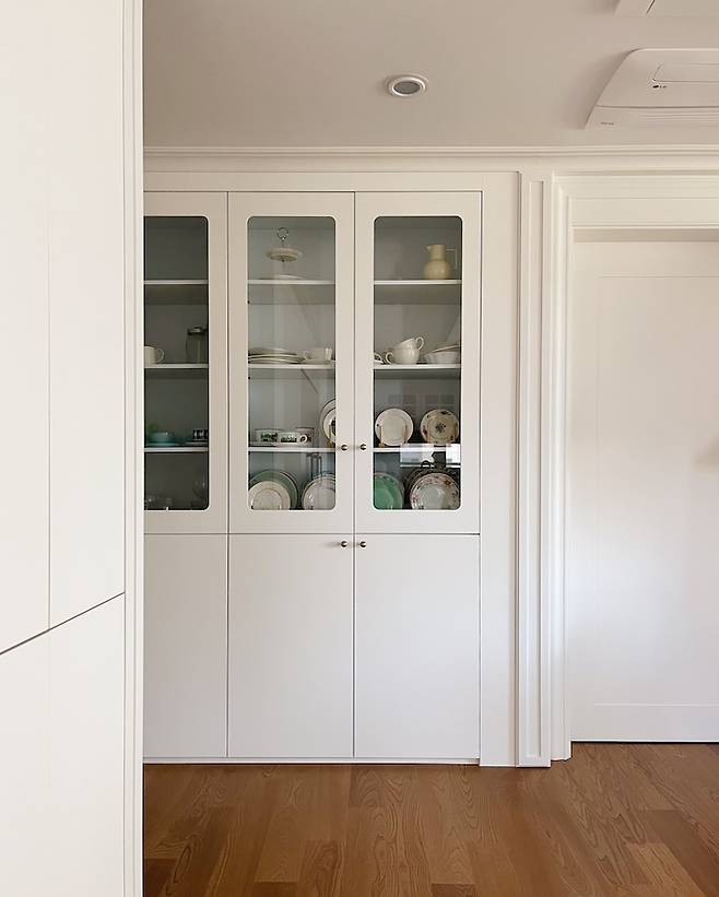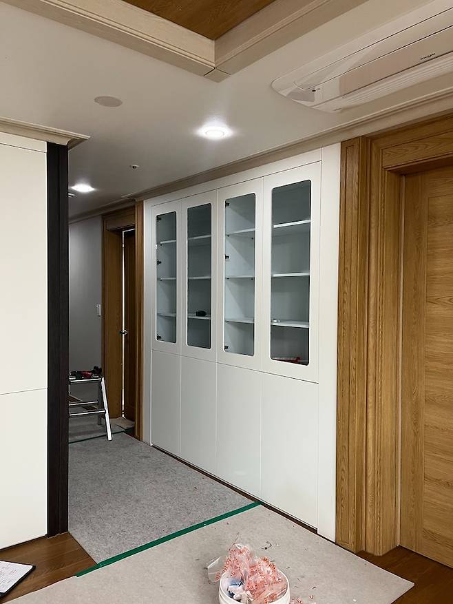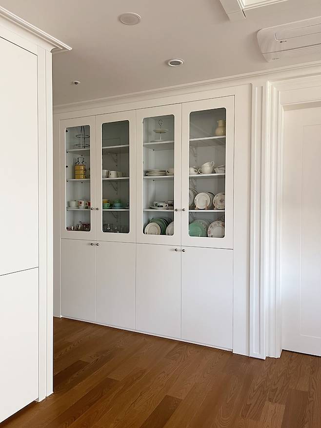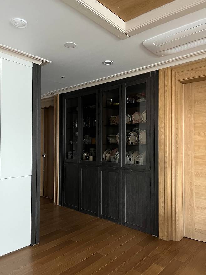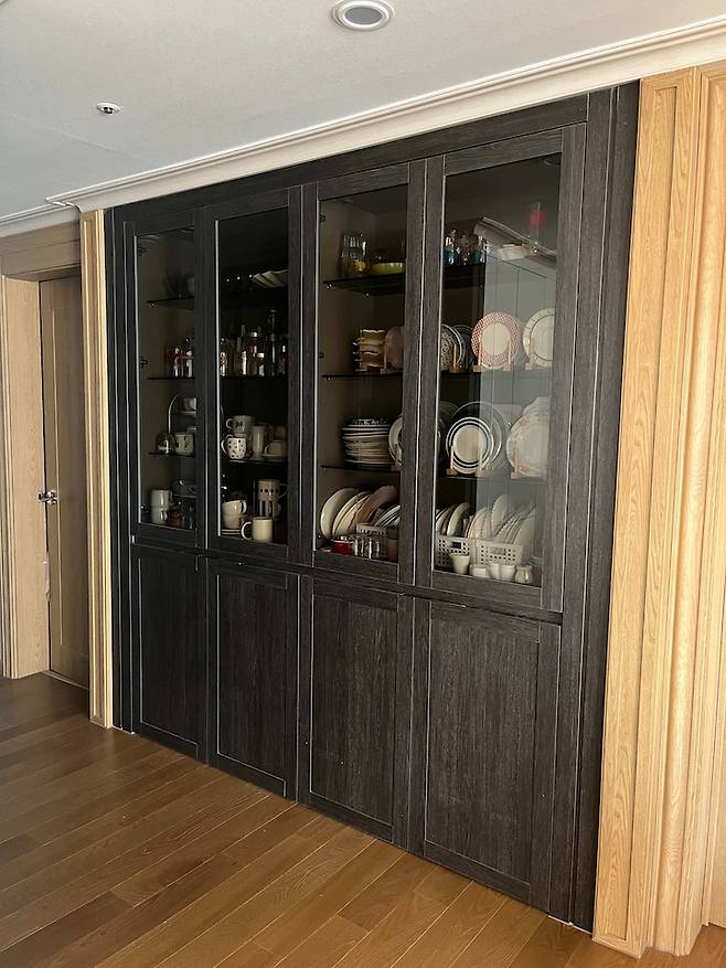 문을 냉장고장처럼 유리 없이 하면 비용은 더 저렴해지는데 너무 밋밋할 것 같아서 하기 싫더라구요. 그릇장에 유리는 꼭 넣고 싶어서 제가 원하는 방향으로 진행했어요.