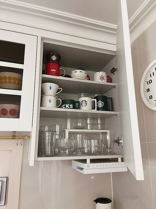 상부장 한 켠에는 스벅존이 있어요. 많지는 않지만 마음에 드는 머그들 모아 놓고 자주 쓰고 있어요.
