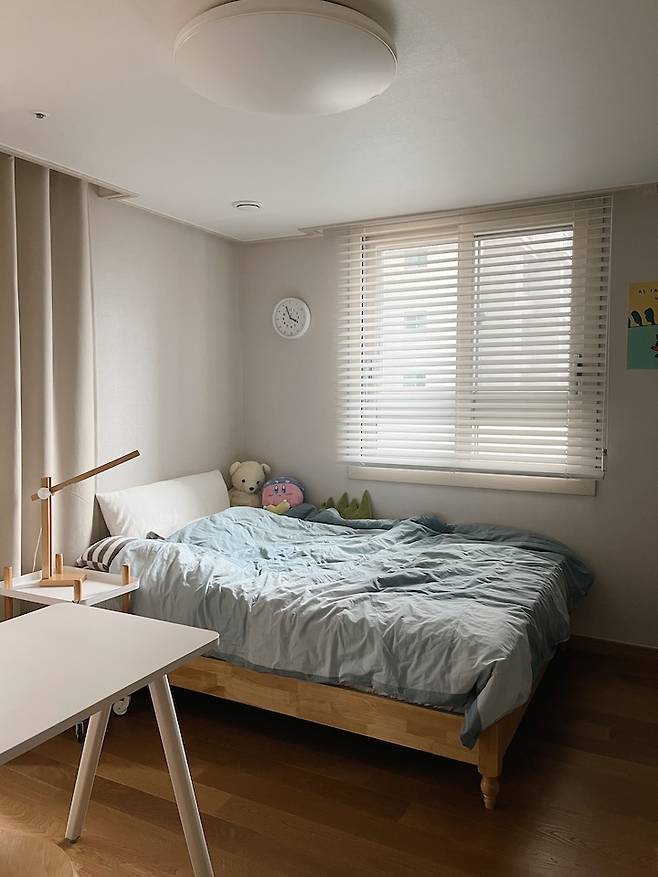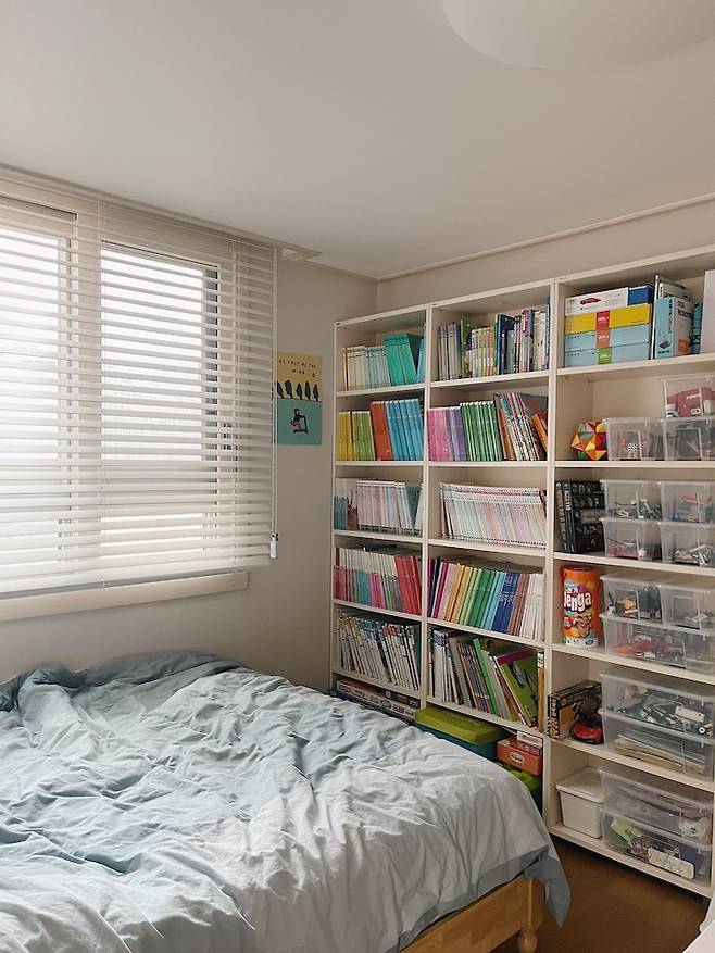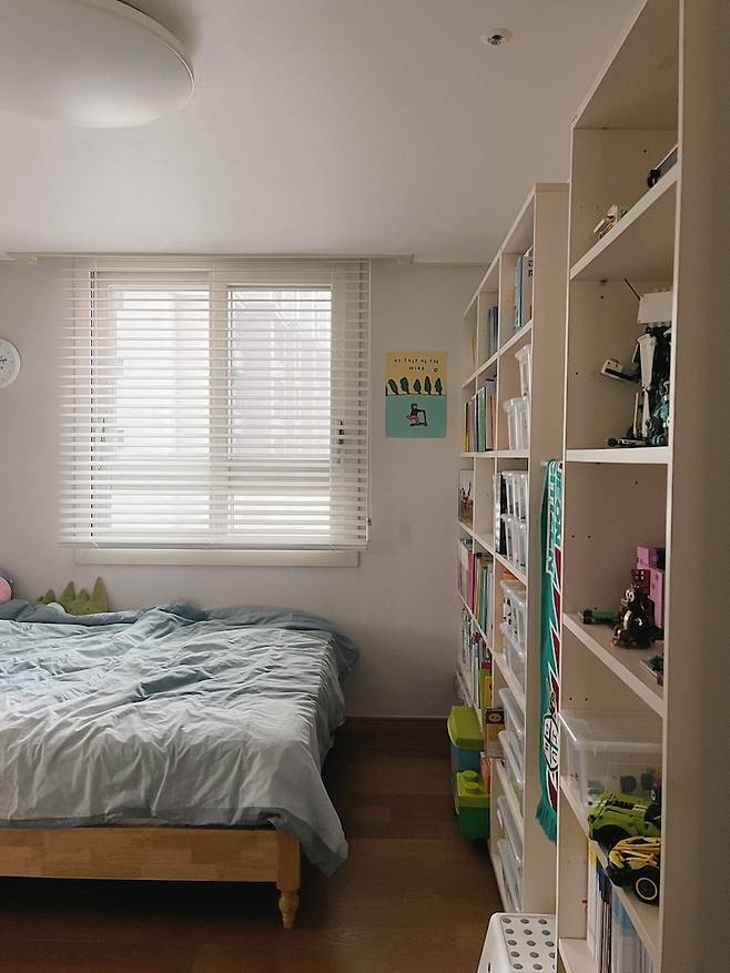 침대 맞은편에는 책장을 두어 일어나면 바로 책이 보이게 동선을 생각해서 배치했어요. 아이방도 역시 톤앤톤! 홈스타일링에서 가장 중요하게 생각하는 부분이에요.