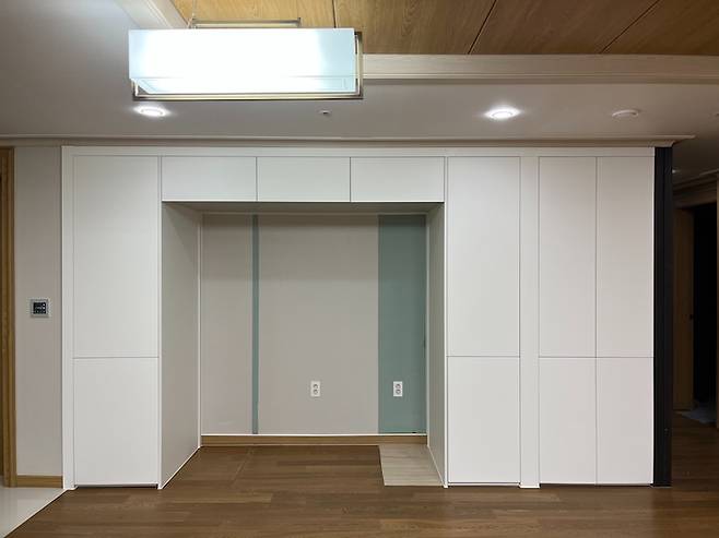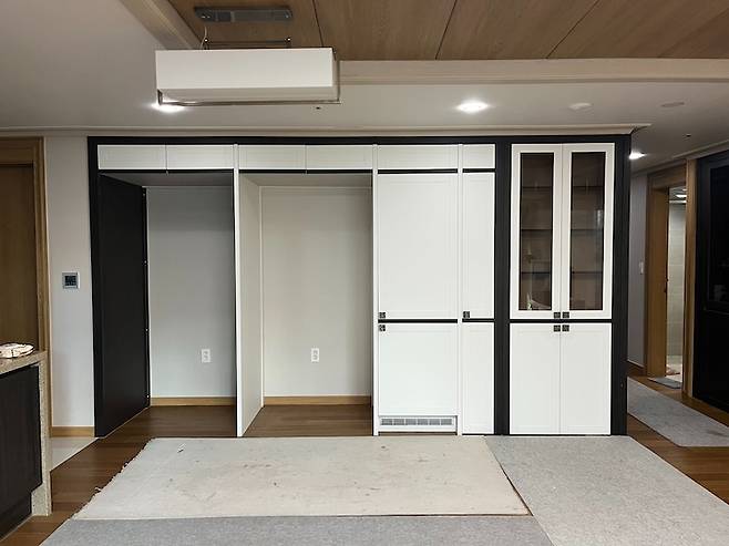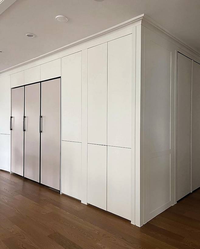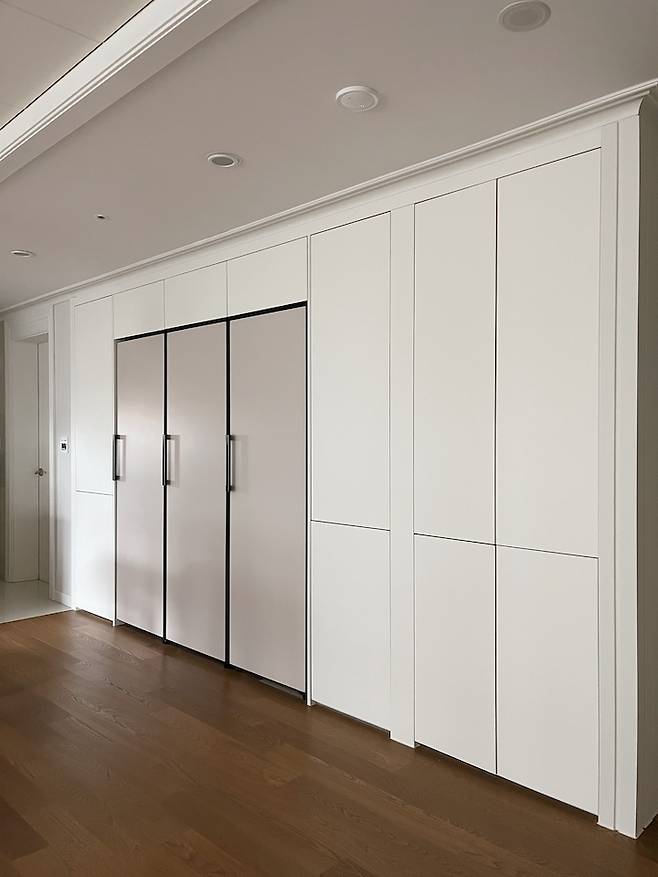 기존에는 냉장고 자리 2개 / 빌트인 냉장고 / 좁은 수납장 / 넓은 수납장으로 구성되어있었는데 다 철거를 하고 하얀 벽처럼 보일 수 있게 통일감 있는 디자인으로 제작을 했어요.