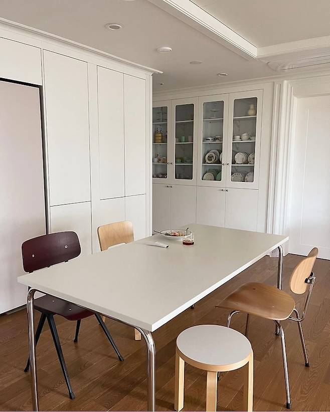 넓은 화이트 테이블에 의자는 모두 다른 디자인으로 배치했어요. 다른 듯 하지만 자세히 보면 우드와 스테인레스 다리로 통일감을 줬답니다. 의자를 좋아해서 특별한 날마다 하나씩 사 모았어요. 그래서 그런지 더 애정이 가는 가구예요.