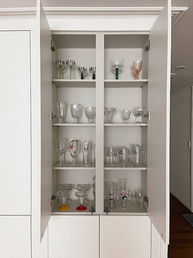 여기는 술잔 라인이에요. 맥주 브랜드 잔, 와인 잔, 소주 잔, 빈티지 잔 등 다양한 술잔이 모여있어요. 주말 저녁마다 남편과 한잔하는데 그릇장 활짝 열고 술잔 고르는 재미가 있어요.