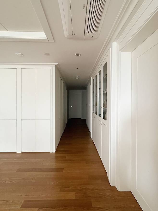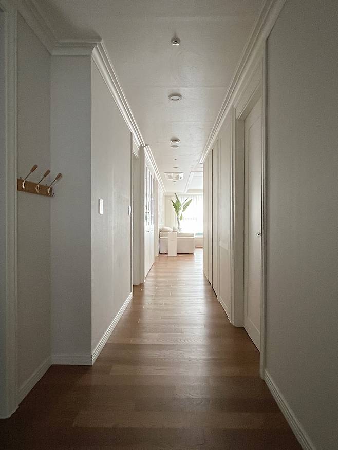 어두웠던 복도가 리모델링 후 밝아진 모습이라 집 전체 분위기에 큰 역할을 하고 있어요. 화이트와 우드의 대비가 따뜻한 느낌을 줘서 마음에 들어요.
