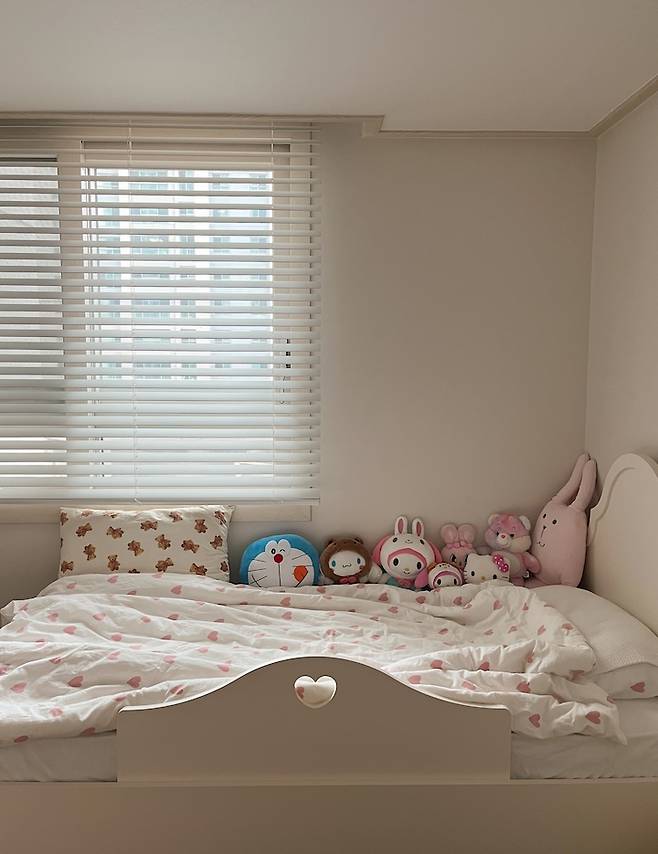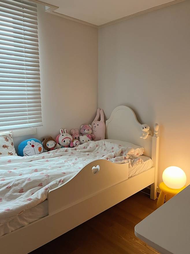 좋아하는 인형들로 가득한 침대예요. 귀여운 하트 침구가 있고 안전하게 가드를 붙여 사용 중이에요. 방 사이즈를 생각해서 싱글 침대를 두었는데 생각보다 넓고 괜찮은 것 같아요.