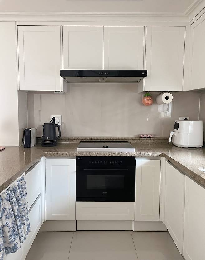 주방에는 꼭 필요한 물건들만 올려놨어요. 커피 머신, 전기포트, 에어 프라이어. 이 세 가지는 매일 쓰는 아이템이에요. 벽에는 아무것도 걸지 않아요. 신혼 때는 조리도구들 다 걸어서 썼는데 예쁘고 편하긴 했지만 기름도 튀고 자꾸 신경 쓰이더라구요. 주방 상판이든 벽이든 아무것도 없는 게 청소하기도 쉽고 깔끔한 것 같아요.