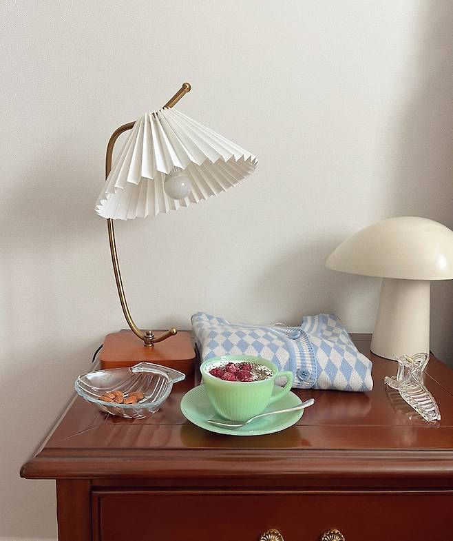 클래식하면서 빈티지한 스타일링을 좋아해요. 색상도 다양하게 쓰구요. 짙은 브라운색 협탁은 집에 있는 기존 가구들과 다른 스타일이라 더 매력적인 것 같아요. 다양한 디자인의 믹스매치가 참 재밌어요.