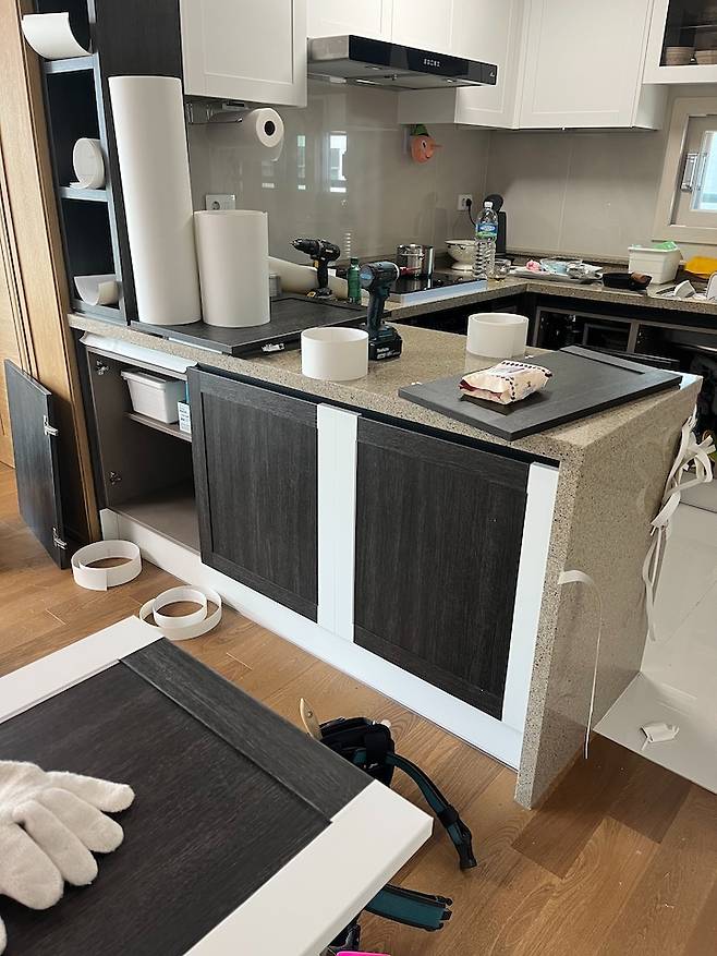 저희 집 주방 문짝이 모두 테두리가 있어서 시간도 많이 걸리고 금액도 더 올라가더라구요. 하루 만에 끝날 줄 알았는데 다음날까지 진행되었어요. 생각보다 디테일한 작업이 많아서 놀라고 신기했어요. 덕분에 옆에서 많이 배웠답니다.