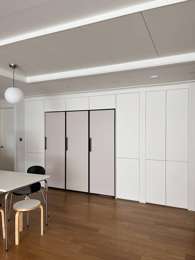 냉장고장 할 때 건들지 못했던 까만 모서리 기둥도 화이트 필름으로 잘 감싸져서 이제야 진짜 완성된 느낌이 들었어요. 제일 오른쪽 부분은 팬트리 문인데 원래 어두운 거울로 되어 있었던 걸 필름으로 다 감쌌어요. 벽이 나눠지지 않게 하나의 벽처럼 보이고 싶어서 그렇게 진행했는데 훨씬 깔끔하고 잘한 선택이었어요.