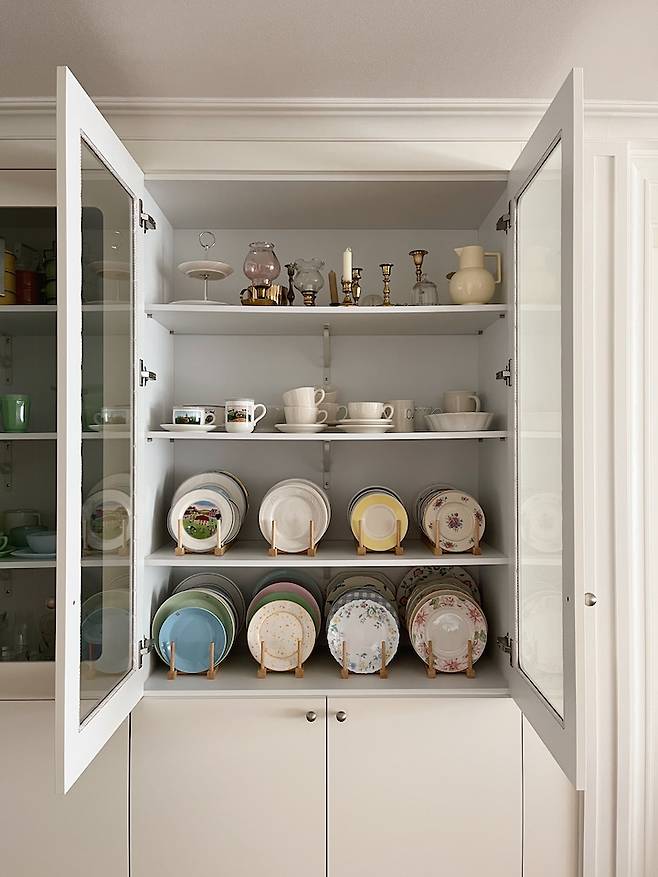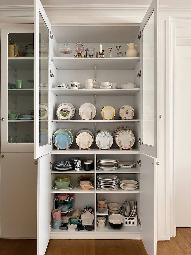 넉넉한 그릇장 덕분에 많은 그릇을 수납할 수 있어요. 그릇 하나하나 다 사연이 있고 추억이 있어요. 언제 어디서 어떤 마음으로 샀는지 다 기억나요. 그만큼 애정이 가는 아이템이에요. 빈티지부터 요즘 그릇들까지.. 안 먹어도 배부른 느낌이에요.