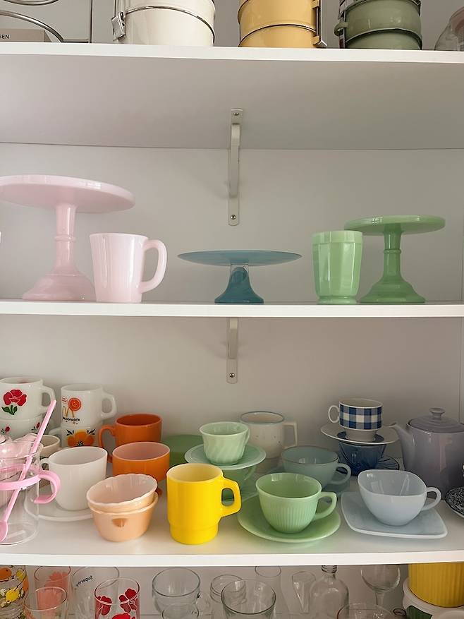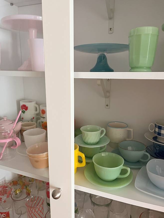 왼쪽 그릇장에는 알록달록한 밀크글라스 빈티지 라인들이 모여있어요. 너무나 영롱하고 아름답죠. 오랜 시간을 함께 해 온 보석과 같은 아이들이에요. 오늘은 어떤 잔에 커피를 마실까~ 그릇장 문을 열 때마다 늘 행복한 고민을 해요.