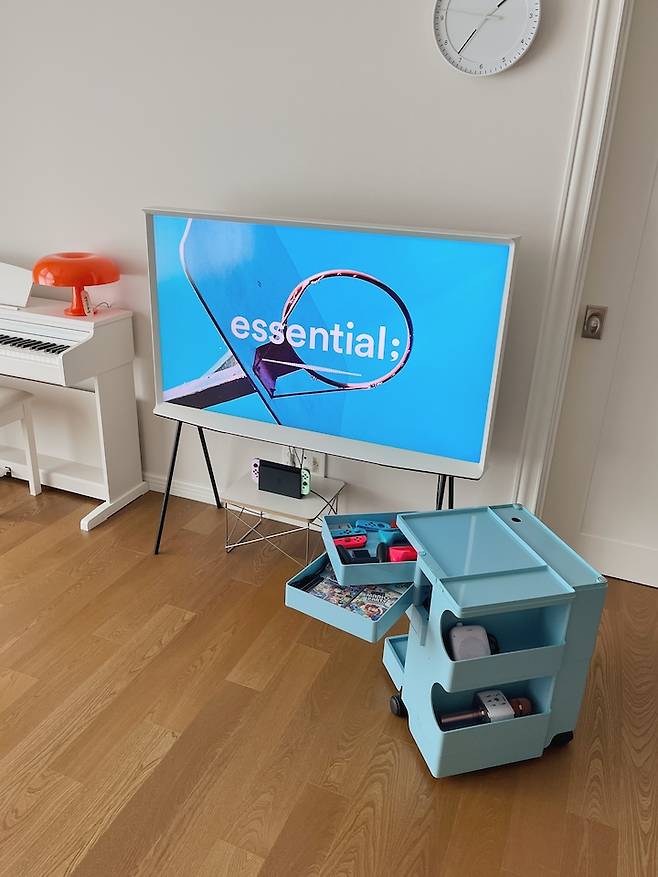 티비 아래에는 원래 아무것도 안 두는데 닌텐도를 구입하고 나서는 그냥 이렇게 쓰고 있어요. 트롤리에 닌텐도 관련 제품을 넣어두니 아이들 스스로 정리하기에 편하고 좋네요.