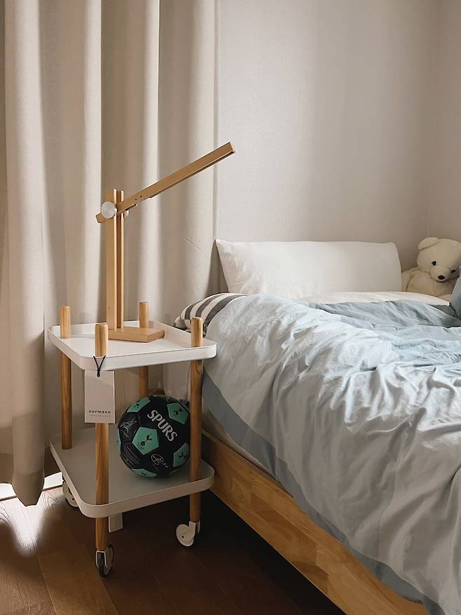 축구, 농구를 좋아해서 아이 주변에 늘 공이 있어요. 침대에 누워서도 공 놀이, 일어나서도 공 놀이~ 굴러다니는 공은 찾기 편하게 트롤리 아래 쪽에 넣어놨어요. 빛 조절이 가능한 램프를 두어 자기 전에 은은한 불빛으로 책도 보고 장난감을 가지고 놀기도 해요.