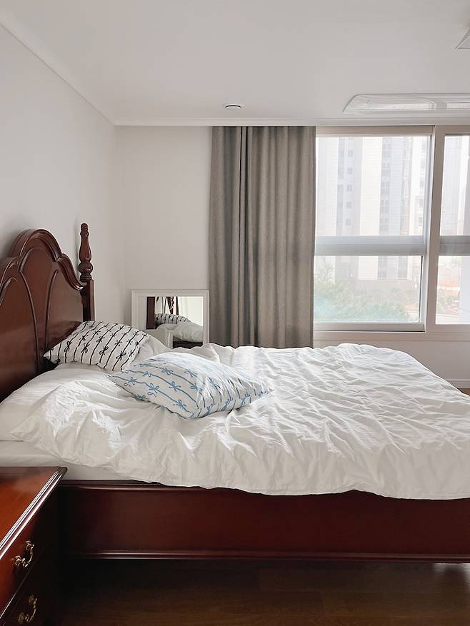 침실은 아늑함이 최우선이에요. 복잡한 건 싫어서 침대와 협탁 외에 다른 가구는 두지 않았어요. 신혼 때부터 항상 그렇게 해왔는데 온전히 숙면을 위한 공간이랍니다. 암막 커튼은 필수예요.