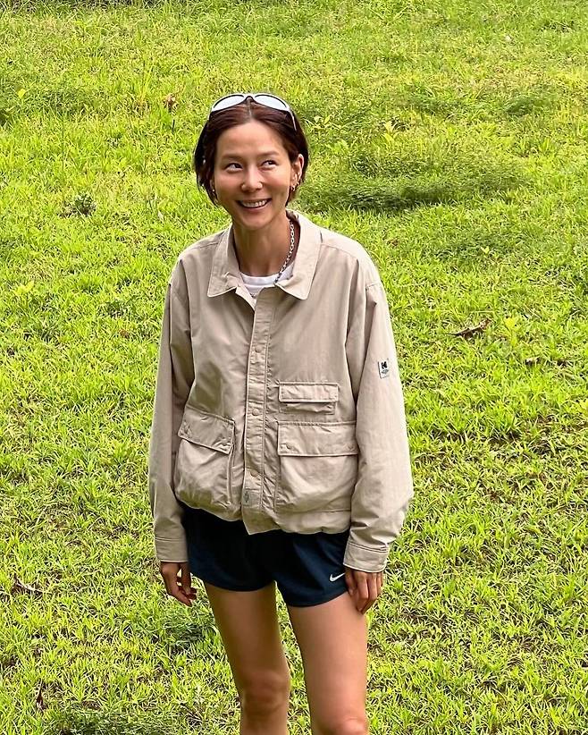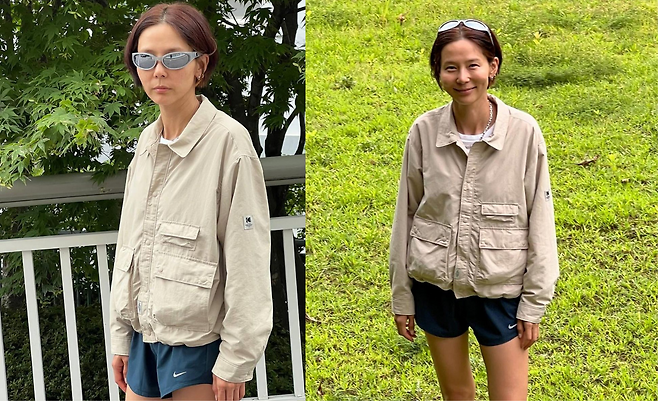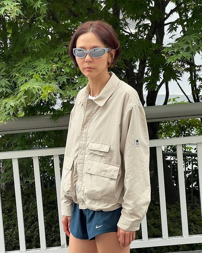 사진 속 김나영은 흰티를 이너로 입고 베이지톤의 자켓과 블랙 트레이닝 숏팬츠를 입어 캐주얼한룩으로 여행을 즐겼다.