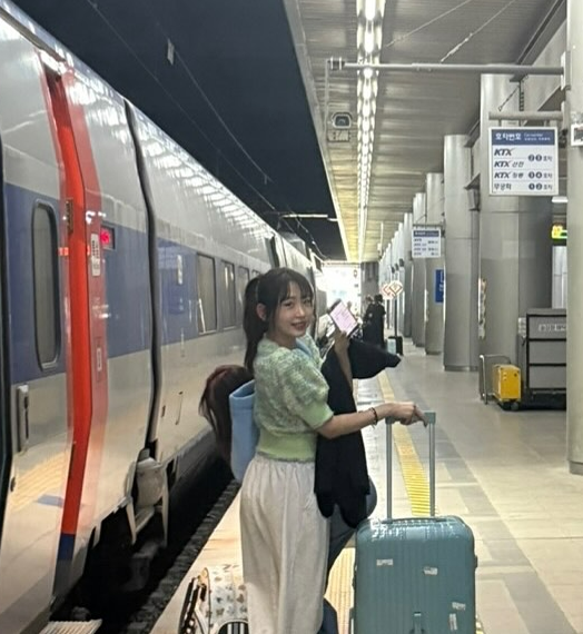 사진 속 강예원은 KTX 플랫폼에서 캐리어를 끌며 환하게 웃고 있는 모습. 내추럴한 스타일에도 불구하고 특유의 생기 가득한 분위기와 밝은 표정이 인상적이다.