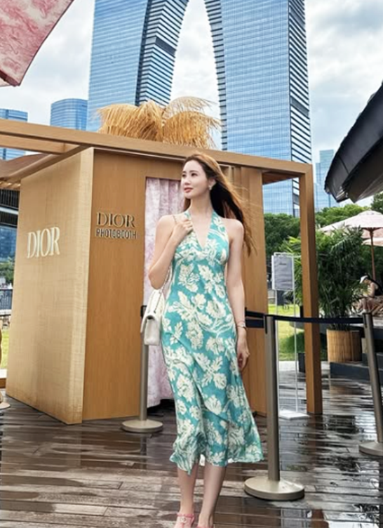 이다해는 푸른색 바탕에 연한 플라워 패턴이 돋보이는 민소매 롱 드레스를 착용해 청량한 서머룩을 연출했다.