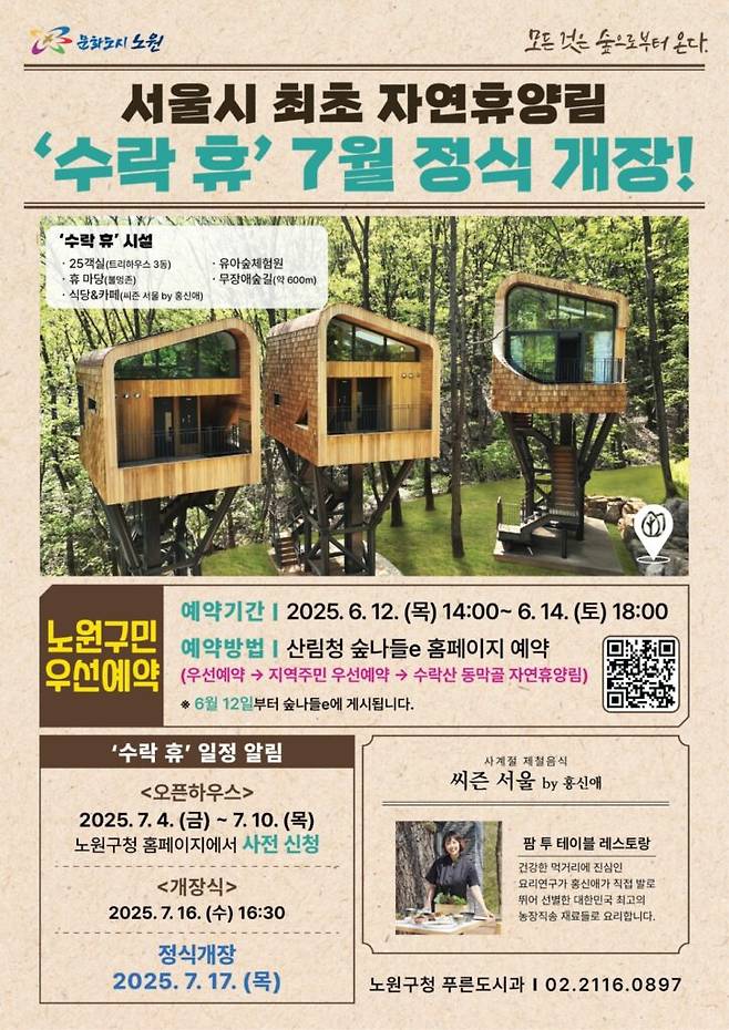 노원구청장은 “서울에서 처음 선보이는 자연휴양림이 수락산에 개장하게 되어 뜻깊다”며 “오랜 시간 기다려준 주민들께 감사드리며, 수락 휴가 구민들의 소중한 기억과 이야기를 담는 공간으로 거듭나길 기대한다”라고 말했다.