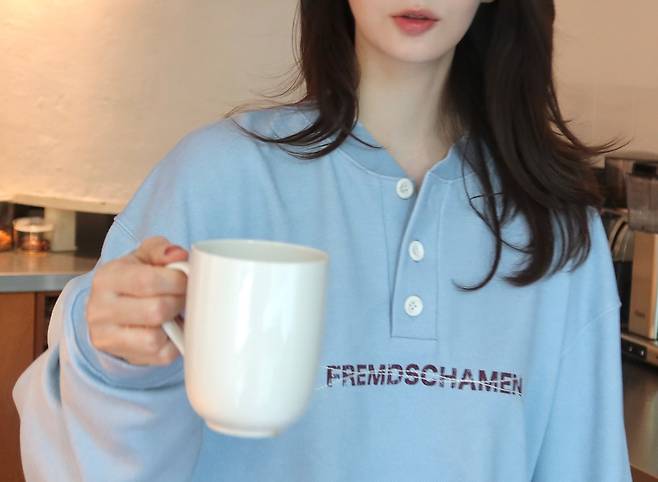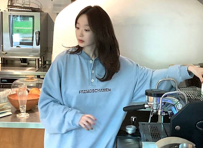 오버핏으로 떨어지는 어깨선과 여유로운 실루엣 덕분에 일상에서의 편안함이 강조되고, 카페·브런치·홈카페 어디에나 어울릴 법한 데일리룩으로 연출됐어요.