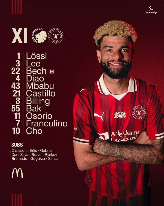 승리를 노리는 미트윌란이 ‘코리안 듀오’ 조규성과 이한범을 모두 선발로 투입한다. 미트윌란은 3-4-1-2 포메이션을 가동하고, 조규성과 프란쿨리노를 공격진에 배치한다. 오소리오가 공격형 미드필더로 나서고, 중원은 박, 카스티요, 빌링, 음바부가 투입된다. 3백은 베흐, 이한범, 디아오가 지키고, 골키퍼 장갑은 뢰슬이 낀다.