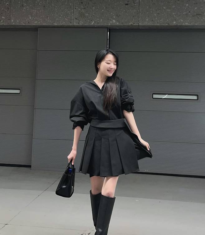 무릎까지 오는 블랙 롱부츠를 매치해 자칫 단조로울 수 있는 코디에 힙한 에너지를 불어넣었으며, 한 손에 든 심플한 블랙 토트백은 전체적인 톤을 통일시키며 안정감을 더해주고 있어요.