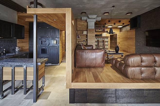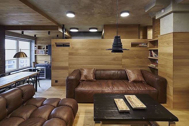 익히 알고는 있지만 다소 생소한 공간 분리 방법이 인더스트리얼함과 결합하면서 Cabin(오두막)과도 같은 분위기의 아파트 내부를 창출했다.